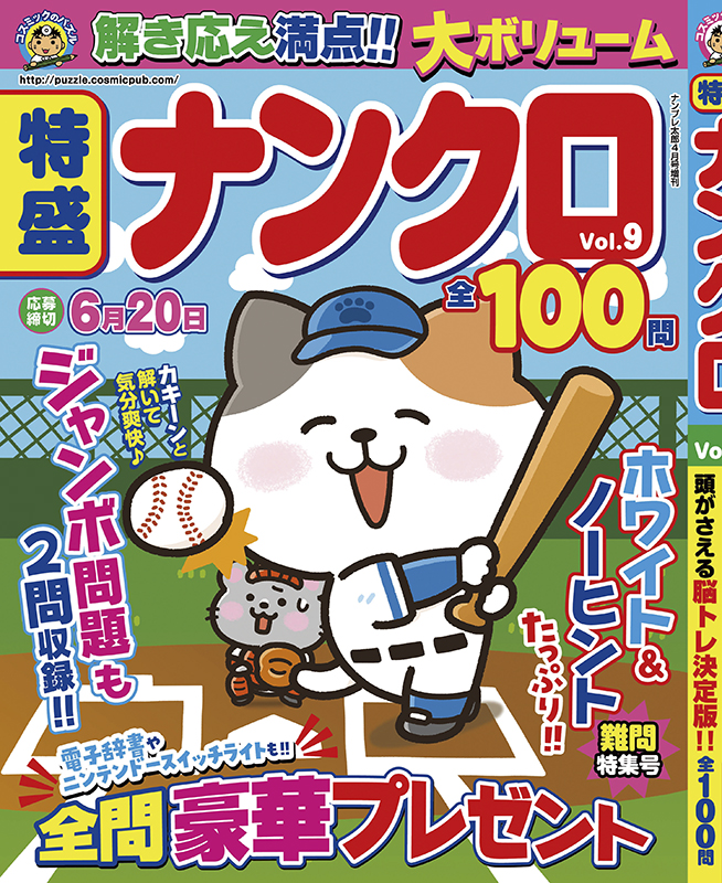 特盛ナンクロ Vol.9 発売日:2024.03.14 \ 730- (本体価格 664円 + 税 66円) ISBN:4910068660442 内容紹介 解き応え満点! 大ボリュームの全100問!! ホワイト&ノーヒントたっぷり!! 難問特集号 もちろん全問プレゼント付き! 電子辞書やニンテンドースイッチライトもあるよ! 応募締切は6月20日 解いたらどんどん応募しよう♪ もっとみる ご購入サイト