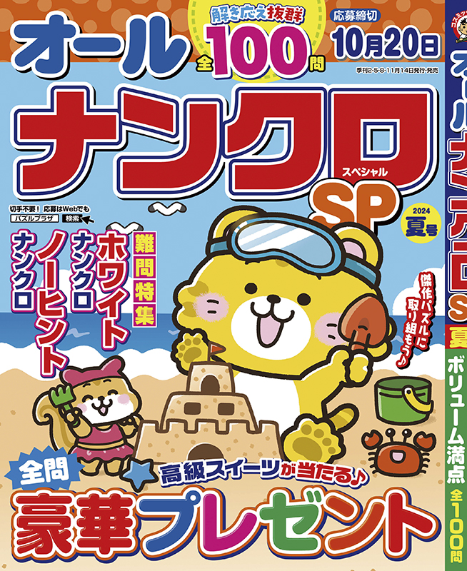 オールナンクロSP夏号 発売日:2024.05.14 \ 620- (本体価格 564円 + 税 56円) ISBN:4910021950641 内容紹介 傑作パズルがずっしり 解きごたえ抜群の全100問!! 特別企画 スペシャルBINGO 銀座千疋屋ギフトカードが 10名様に当たる!! 難問特集 濁点・半濁点、ノーヒント、ホワイトetc 仕掛け付きナンクロが勢ぞろい! 応募締切は10月20日 解いたらどんどん応募しよう♪ もっとみる ご購入サイト
