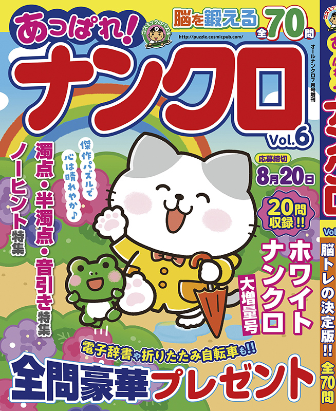 あっぱれ! ナンクロ Vol.6 発売日:2024.05.27 \ 650- (本体価格 591円 + 税 59円) ISBN:4910021820746 内容紹介 傑作パズルで心は晴れやか♪ 言葉がひらめく全70問!! たっぷり全20問収録! ホワイトナンクロ特集号 もちろん全問プレゼント付き! 電子辞書や折りたたみ自転車もあるよ! 応募締切は8月20日 解いたらどんどん応募しよう♪ もっとみる ご購入サイト