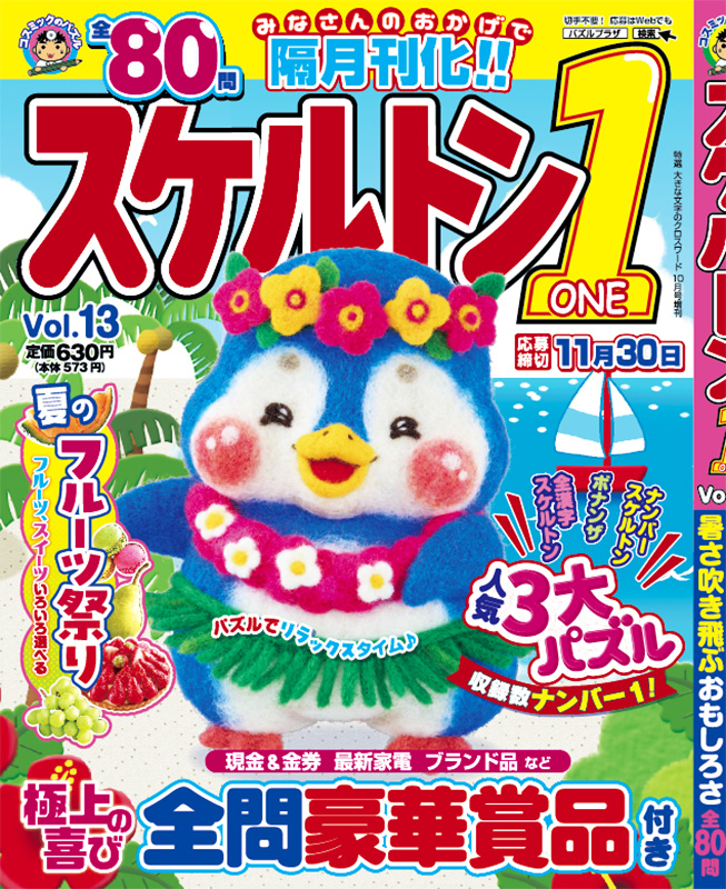 ナンバースケルトン10問、全漢字スケルトン9問、ボナンザ8問その他にも、バラエティに富んだスケルトンとイラストがかわいいアローが満載!!