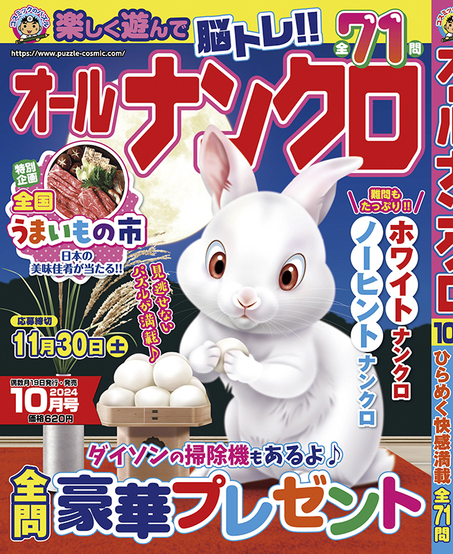 オールナンクロ10月号 発売日:2024.08.19 \ 620- (本体価格 564円 + 税 56円) ISBN:4910021811041 内容紹介 ひらめく快感満載! 楽しく遊べる全71問!! 特別企画 全国うまいもの市 日本の美味佳肴が当たる! ホワイトナンクロ、 ノーヒントナンクロなど難問たっぷり! 応募締切は11月30日 解いたらどんどん応募しよう♪ もっとみる ご購入サイト