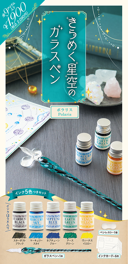 星空のガラスペン1本に、インク5本、インクカードやペンレストもついた全9アイテムのとってもお得なセット。買ったその日から始められ、初めてのガラスペンにもぴったりです。