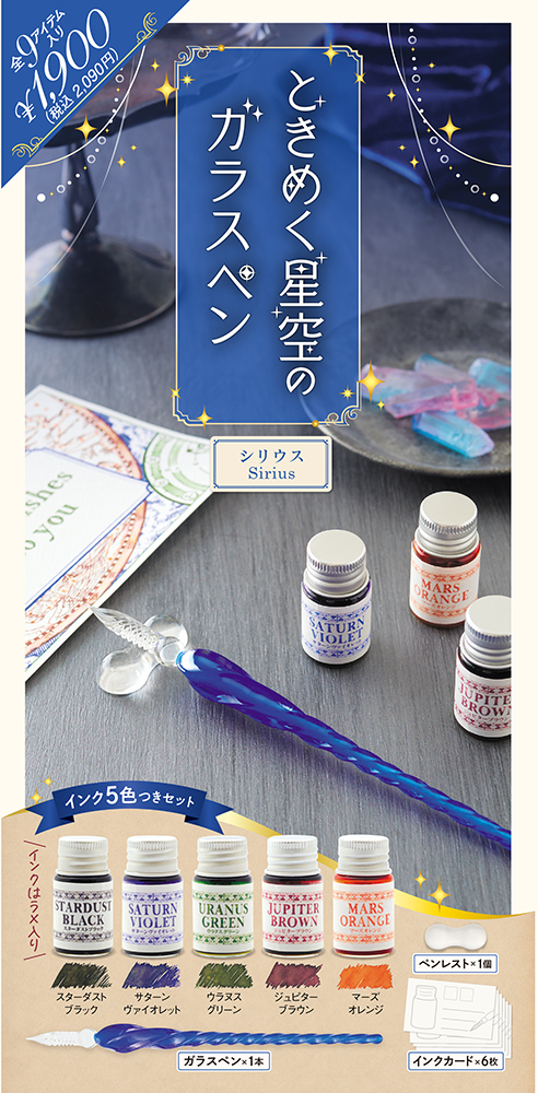 星空のガラスペン1本に、インク5本、インクカードやペンレストもついた全9アイテムのとってもお得なセット。買ったその日から始められ、初めてのガラスペンにもぴったりです。