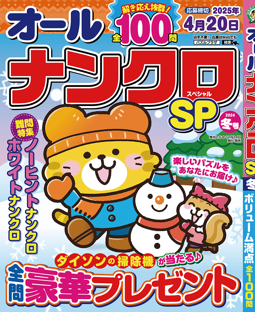 オールナンクロSP冬号 発売日:2024.11.14 \ 640- (本体価格 582円 + 税 58円) ISBN:4910021951242 内容紹介 年末年始のお供にピッタリ!! ボリューム満点の全100問!! 特別企画 スペシャルBINGO 旬のフルーツカタログが 10名様に当たる!! 難問特集 濁点・半濁点、ノーヒント、ホワイトetc 仕掛け付きナンクロが勢ぞろい! 応募締切は2025年4月20日 解いたらどんどん応募しよう♪ もっとみる ご購入サイト
