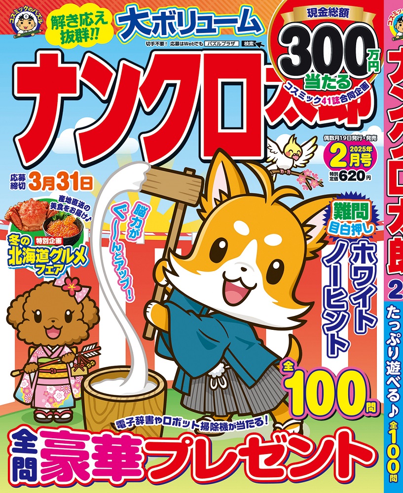 ナンクロ太郎2月号 発売日:2024.12.18 \ 620- (本体価格 564円 + 税 56円) ISBN:4910068750259 内容紹介 傑作パズルで脳力アップ! たっぷり遊べる全100問! 難問に挑戦しよう! 濁点・半濁点・ホワイト大特集♪ 人気家電やブランド品たっぷり! もちろん全問プレゼント付き♪ 応募締切は3月31日! どんどん応募してね♪ もっとみる ご購入サイト