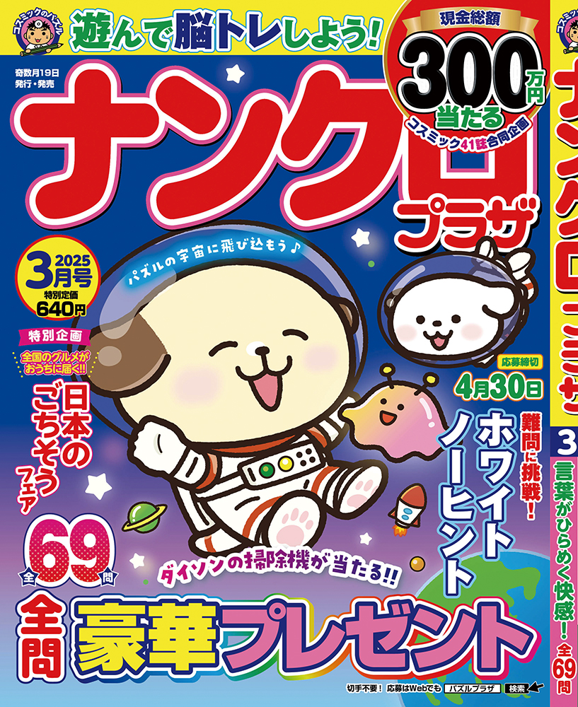 ナンクロプラザ3月号 発売日:2025.01.18 \ 640- (本体価格 582円 + 税 58円) ISBN:4910168050358 内容紹介 パズルで遊んで脳トレしよう! 言葉がどんどんひらめく全69問!! 特別企画 日本のごちそうフェア 全国のグルメがおうちに届く♪ 大人気のホワイトナンクロと ノーヒントナンクロも収録!! もちろん全問プレゼント付き! 応募締切は4月30日 解いたらどんどん応募しよう♪ もっとみる ご購入サイト