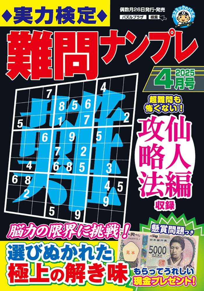 実力検定難問ナンプレ 4月号 発売日:2025.02.26 ふじいしのぶ \ 550- (本体価格 500円 + 税 50円) ISBN:4910049310458 内容紹介 珠玉の解き応えに きっとあなたものめり込む 脳活性パズルの決定版!! 脳力の限界に挑戦! 選びぬかれた極上難問 目標タイム25~80分 超難問も怖くない! 「仙人編攻略法」収録 みんなうれしい♪ 現金が当たる!! 検定問題10問掲載 もっとみる ご購入サイト