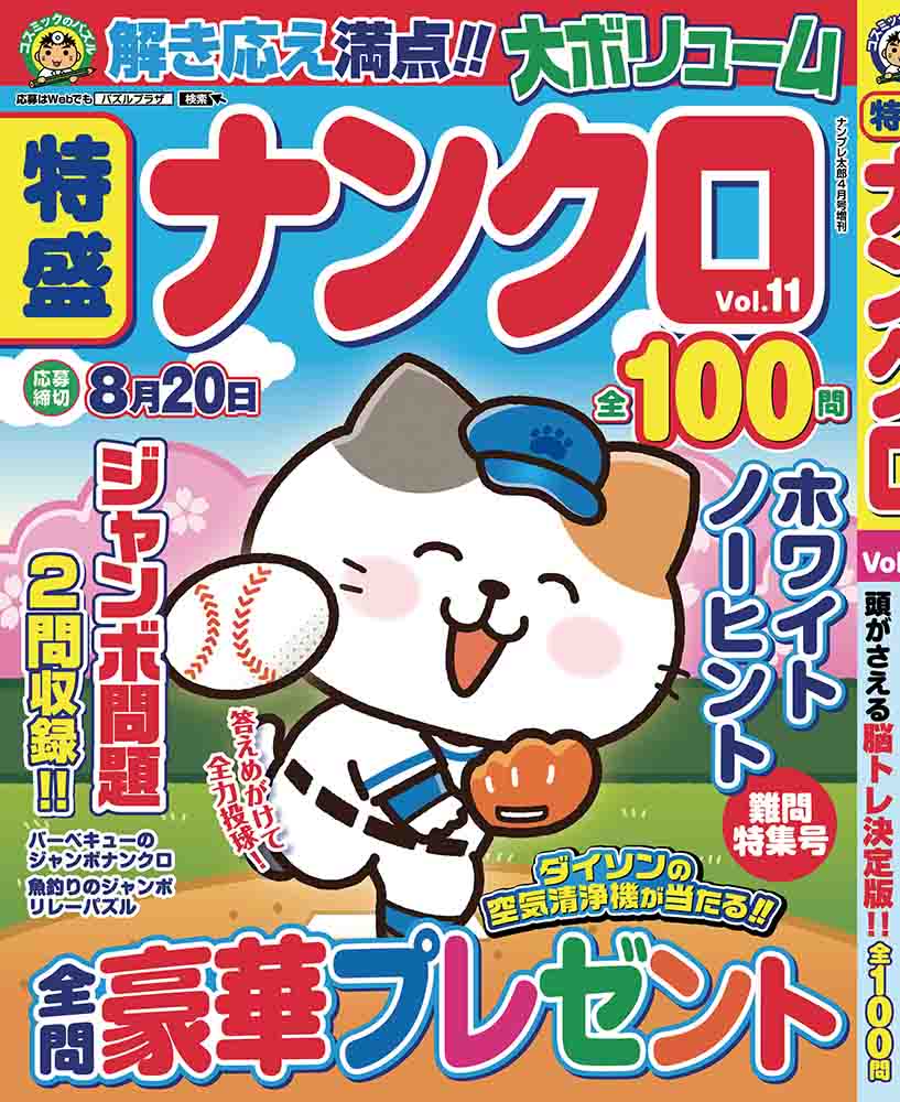 特盛ナンクロ Vol.11 発売日:2025.03.13 \ 750- (本体価格 682円 + 税 68円) ISBN:4910068660459 内容紹介 解き応え満点! 大ボリュームの全100問!! ホワイト&ノーヒントたっぷり!! 難問特集号 ジャンボ問題も2問収録!! もちろん全問プレゼント付き! ダイソンの空気清浄機もあるよ! 応募締切は8月20日 解いたらどんどん応募しよう♪ もっとみる ご購入サイト