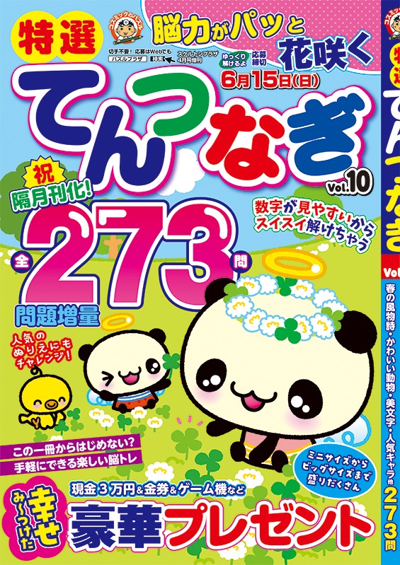 特選てんつなぎ Vol.10 発売日:2025.03.05 \ 750- (本体価格 682円 + 税 68円) ISBN:4910154180458 内容紹介 祝隔月刊化! 脳力がパッと花咲く全273問 問題増量中 鉛筆一本で手軽に楽しめる脳トレ本! 面白い問題が盛りだくさん♪ 大きな数字で、問題がくっきり見やすい プレゼントの応募締切は 6月15日! 応募&お便りお待ちしています。 もっとみる ご購入サイト