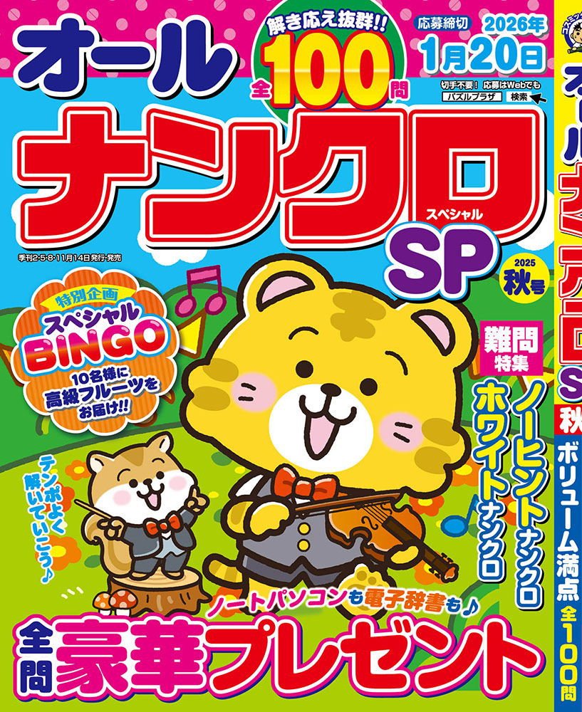 オールナンクロSP秋号 発売日:2025.08.12 \ 640- (本体価格 582円 + 税 58円) ISBN:4910021950955 内容紹介 テンポよく解いていこう♪ 解き応え抜群の全100問!! 特別企画 スペシャルBINGO 旬の高級フルーツが 10名様に当たる!! 難問特集 濁点・半濁点、ノーヒント、ホワイトetc 仕掛け付きナンクロが勢ぞろい! 応募締切は2026年1月20日 解いたらどんどん応募しよう♪ もっとみる ご購入サイト