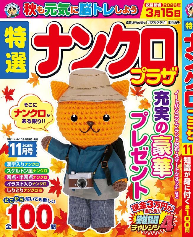 特選ナンクロプラザ11月号 発売日:2025.10.02 \ 730- (本体価格 664円 + 税 66円) ISBN:4910066231156 内容紹介 秋も元気に脳トレしよう! 知識が身に付く全100問! 現金3万円が当たるチャンス! 「難問チャレンジ4」 現金・金券、ブランド品もたっぷり♪ 豪華プレゼントつき! 応募締切 2026年3月15日 どしどし応募してね! もっとみる ご購入サイト