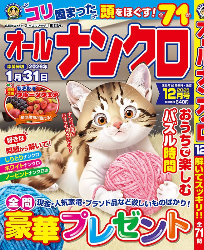 オールナンクロ12月号 発売日:2025.10.18 \ 640- (本体価格 582円 + 税 58円) ISBN:4910021811256 内容紹介 おうちでパズル時間を楽しもう! コリ固まった頭をほぐす全71問!! 特別企画「もぎたてフルーツフェア」 で旬の果物が当たる! ホワイトナンクロ、 ノーヒントナンクロなど難問もたっぷり! 応募締切は2026年1月31日 好きな問題から解いてどんどん応募しよう♪ もっとみる ご購入サイト