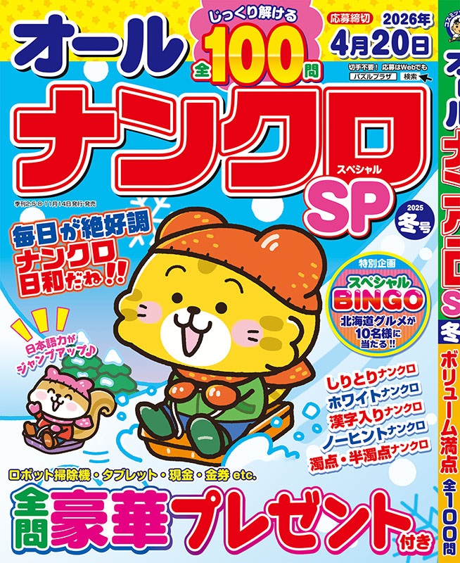 オールナンクロSP冬号 発売日:2025.11.14 \ 640- (本体価格 582円 + 税 58円) ISBN:4910021951259 内容紹介 毎日が絶好調のナンクロ日和だね!! ボリューム満点全100問!! 特別企画 スペシャルBINGO 北海道グルメが 10名様に当たる!! 人気の濁点・半濁点、ノーヒント、ホワイトetc 仕掛け付きナンクロが勢ぞろい! 応募締切は2026年4月20日 解いたらどんどん応募しよう♪ もっとみる ご購入サイト