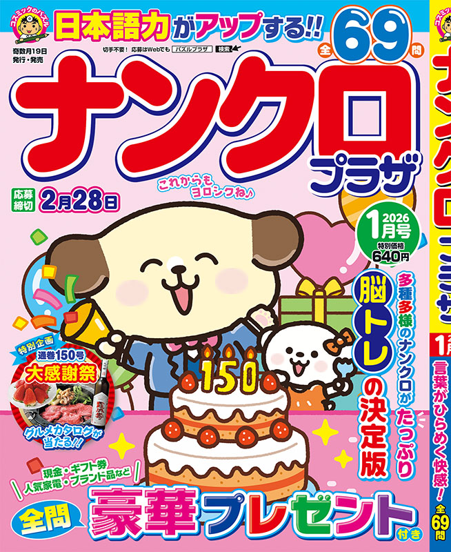 ナンクロプラザ1月号 発売日:2025.11.18 \ 640- (本体価格 582円 + 税 58円) ISBN:4912168050161 内容紹介 日本語力がアップする! 脳トレの決定版 ナンクロ全69問!! 特別企画 通巻150号 大感謝祭 グルメカタログが当たる! 大人気のホワイトナンクロとノーヒントナンクロなど変わり種ナンクロも収録!! もちろん全問プレゼント付き! 応募締切は2月28日(土) 解いたらどんどん応募しよう♪ もっとみる ご購入サイト