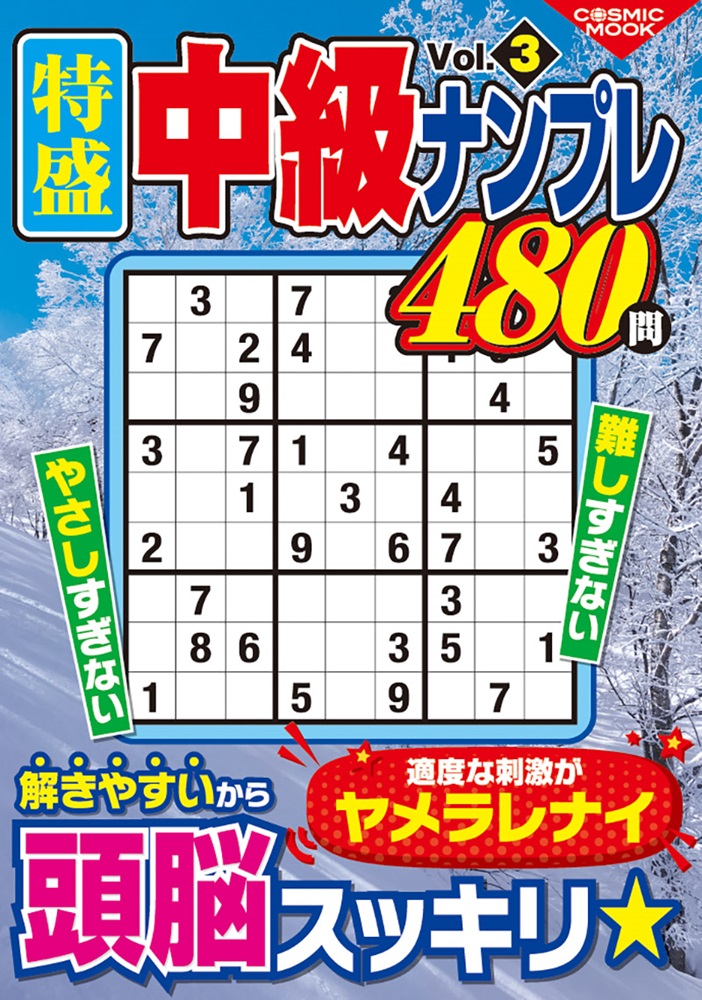 特盛中級ナンプレVol.3 発売日:2025.11.28 \ 750- (本体価格 682円 + 税 68円) ISBN:9784774775340 内容紹介 解きやすい 適度な刺激が 心地いい 大人気の中級ナンプレがギッシリ詰まった 全480問 難しすぎない やさしすぎない サクサク解けて 頭脳スッキリ★ 寒い冬こそ 爽快ナンプレで 頭も体もホットにすごそう♪ もっとみる ご購入サイト