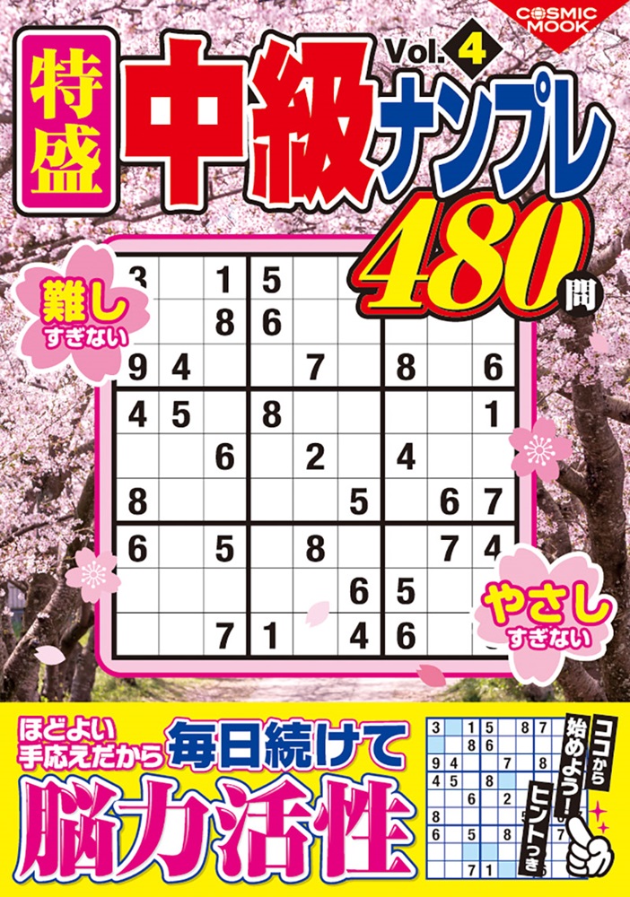 NEW 特盛中級ナンプレVol.4 発売日:2026.01.28 \ 750- (本体価格 682円 + 税 68円) ISBN:9784774775494 内容紹介 解き心地がちょうどいい♪ 大人気の中級ナンプレがギッシリ詰まった 全480問 難しすぎない やさしすぎない ほどよい手応えだから 毎日続けて脳力活性 春爛漫の桜吹雪を待ちながら スッキリ解いて頭脳は春眠知らず★ もっとみる ご購入サイト