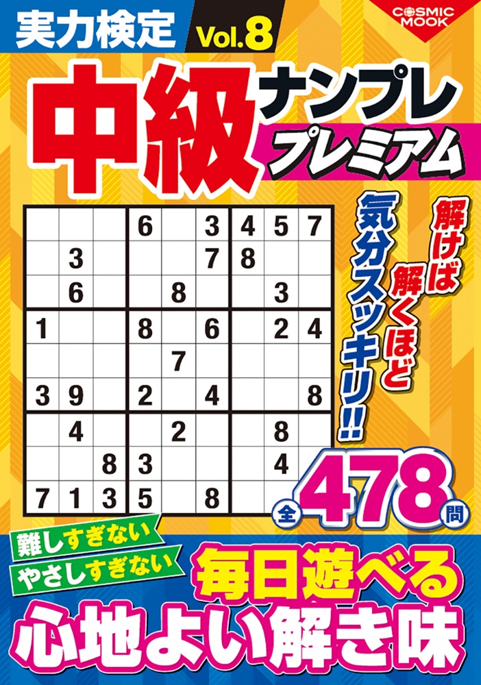 NEW 実力検定中級ナンプレプレミアムVol.8 発売日:2026.02.14 \ 730- (本体価格 664円 + 税 66円) ISBN:9784774775555 内容紹介 解けば解くほど 気分スッキリ!! 大人気!『実力検定中級ナンプレ』プレミアム版!! 難しすぎない やさしすぎない サクサク解ける解き心地だから 毎日遊べる 楽しめる♪ 頭脳活性に最適な心地よい解き味の 極上ナンプレ 全478問掲載! もっとみる ご購入サイト